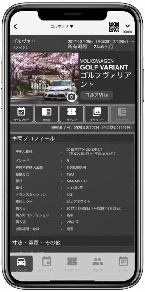 現在の愛車の諸元表やカスタマイズスペック情報、ギャラリー等を管理できます。また車検証を管理しておくことで、いつでも車検証を確認でき、次回車検日はカレンダーに管理されます。